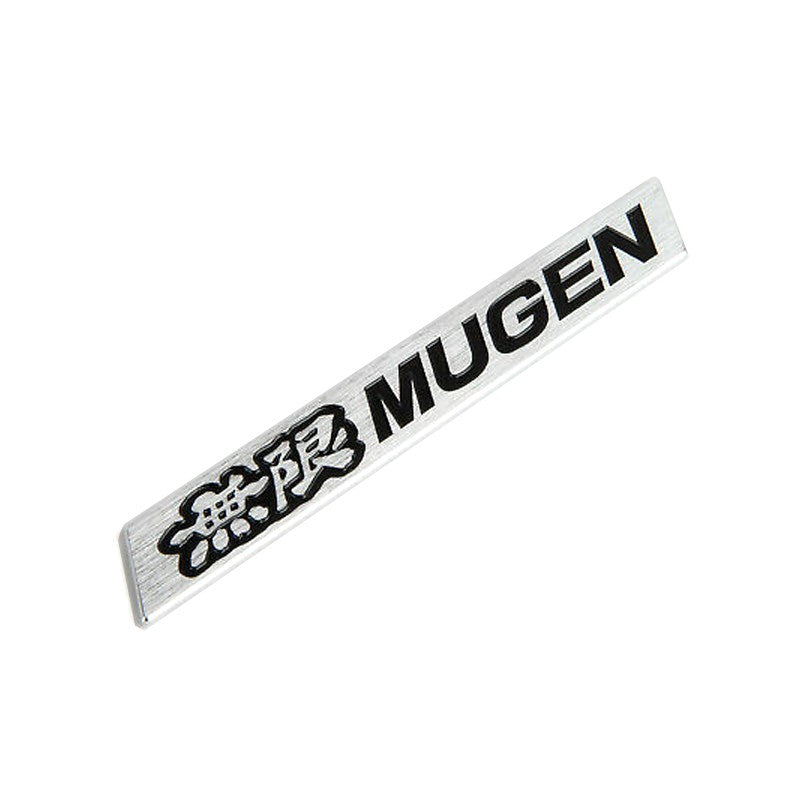 Small metal Mugen emblem, with brushed effect and black lettering.